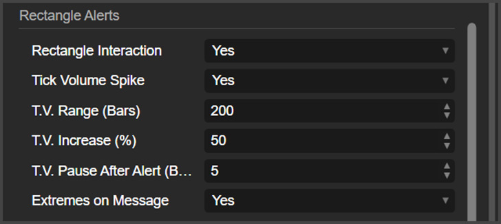Tick Volume Spike: This enables tick volume spike alerts when they happen inside a rectangle (Supply and Demand regions).