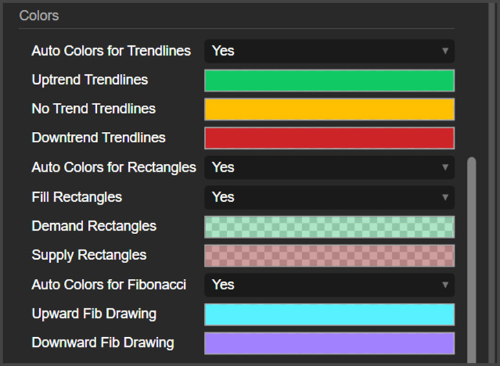 Here, you can customize the appearance of the tools. The name of the parameters are self-explanatory. As you can see, you can change the colors and enable or disable automatic colors for the tools this indicator manages.