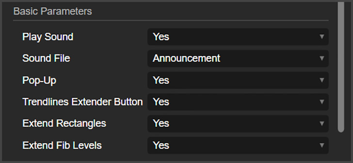 Extend Rectangles: This indicator treats rectangles as supply and demand regions. If you activate this, the rectangles you draw on the chart will be extended to the current candle automatically.