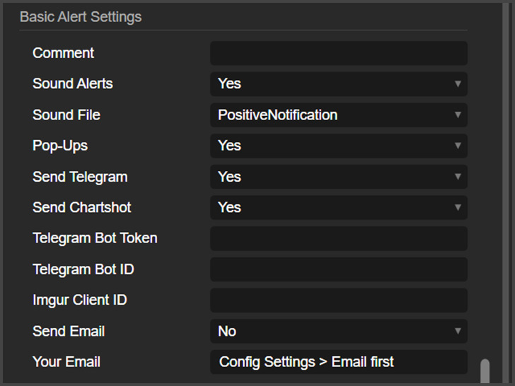Send Chartshot: A chartshot is a screenshot of the chart, and here is where you can enable Telegram messages with screenshots.