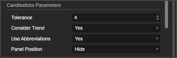 Tolerance: This is where you change how strict the candlestick patterns detection will be. It ranges from 1 to 5, where 1 is the strictest. Selecting a higher tolerance level will result in more patterns detected, but the proportions of these patterns can be less accurate.