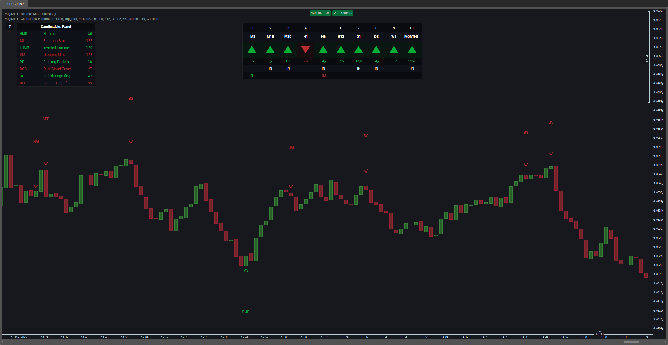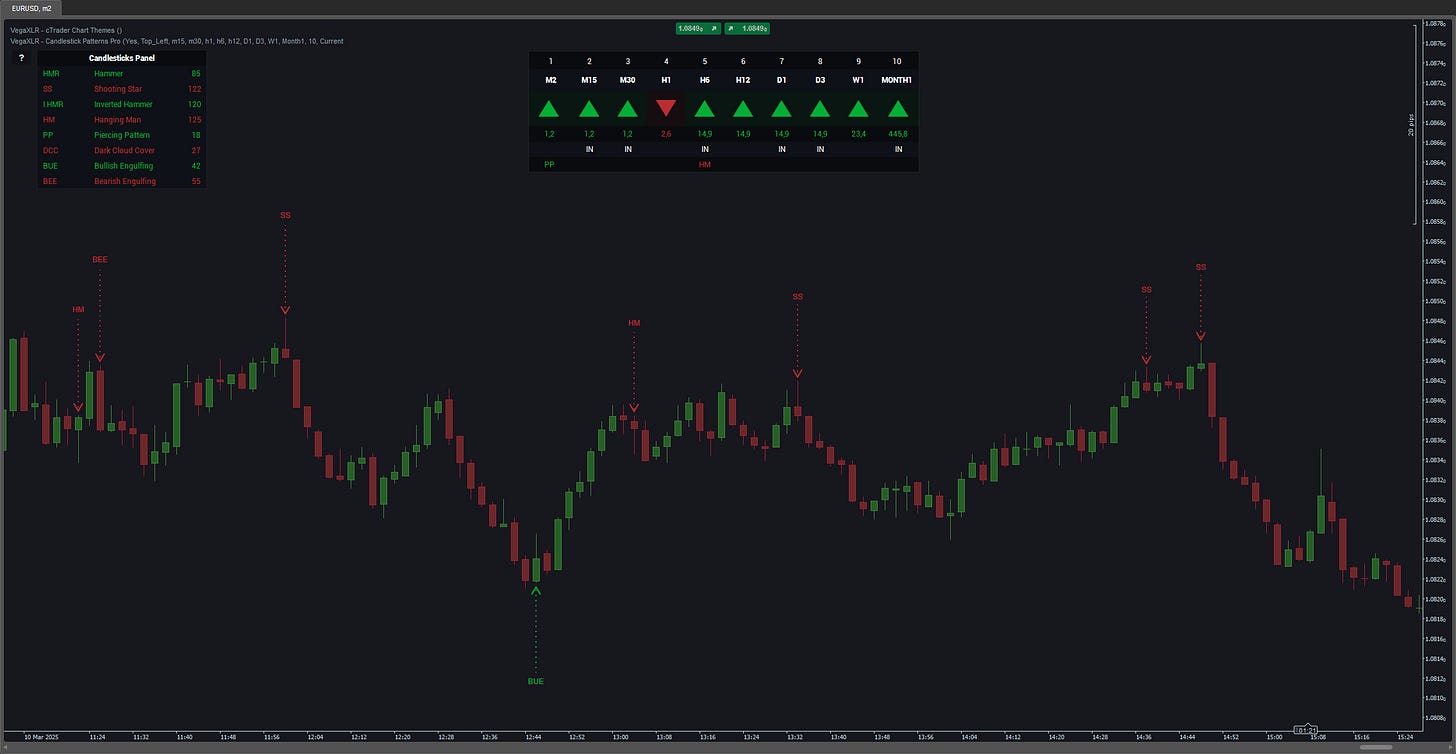 Simultaneous Multi-Timeframe Detection of 34 Candlestick Patterns in cTrader