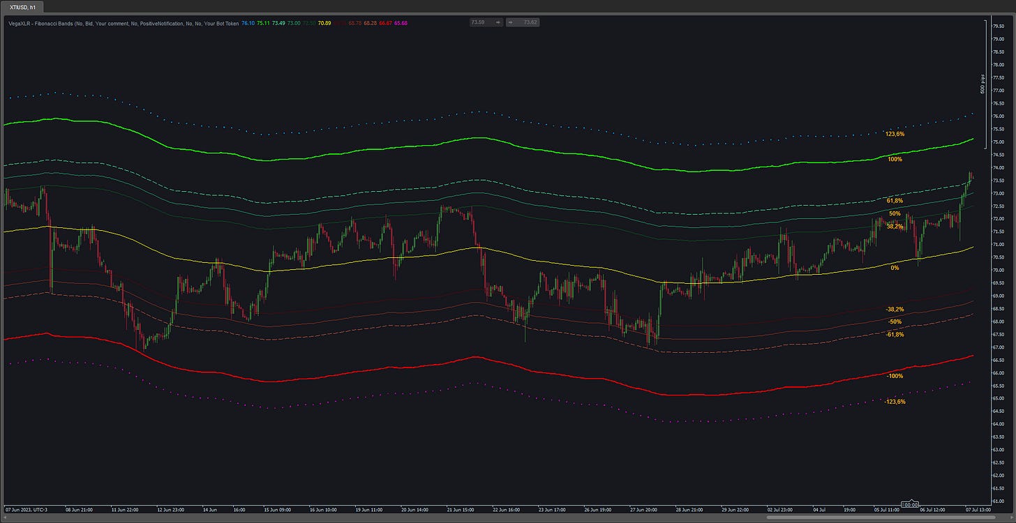 In summary, the VegaXLR - Fibonacci Bands indicator combines Fibonacci analysis and moving averages to help identify potential support and resistance levels. With configurable alert functionality and visualization options, it's an invaluable tool for traders who rely on Fibonacci retracements or expansions.