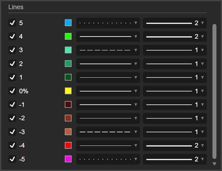 Here you can customize the Fibonacci bands on the chart. As you can see, you can enable/disable them, change the colors, change the thickness, and change the style of the lines.