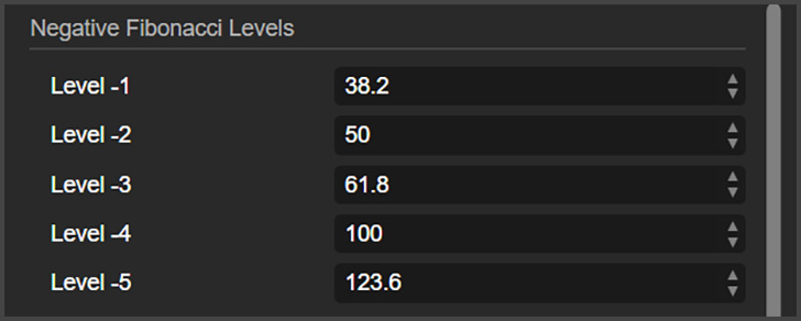 Here you can configure the Fibonacci levels that will be plotted below the 0% line (The base moving average)