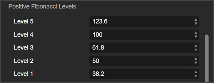 Here you can configure the Fibonacci levels that will be plotted above the 0% line (The base moving average)