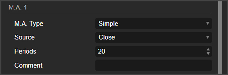 Here you choose the first moving average. You can select any type of moving average present on cTrader. The comment parameter is where you type a comment that will be displayed in the alert messages.