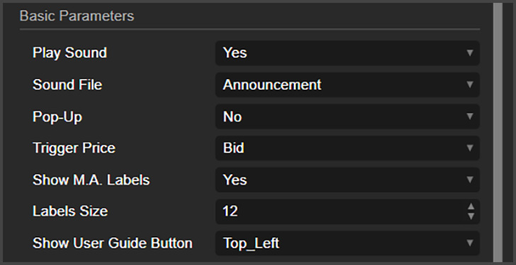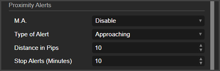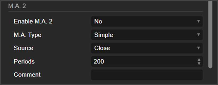 Here you can enable and configure the second moving average. If you want to receive M.A. Crossover Alerts or Proximity Alerts, you must enable this.