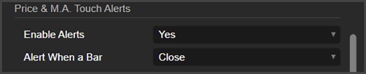 Alert When a Bar: You can choose if you want these alerts to trigger then a bar closes touching a moving average or immediately when it touches a moving average.